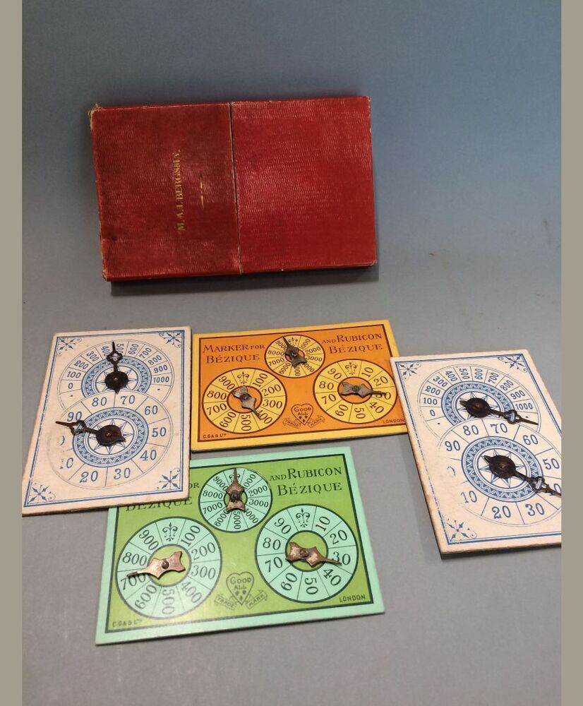Bezique, etui met twee kaarten, twee met twee en twee kaarten met drie klokken