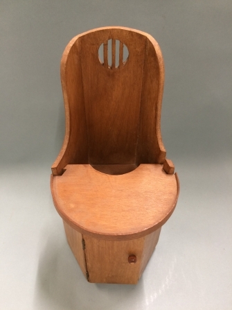 Miniatuur kinderstoel van iepenhout op vier poten met deurtje met bijbehorend testje en po