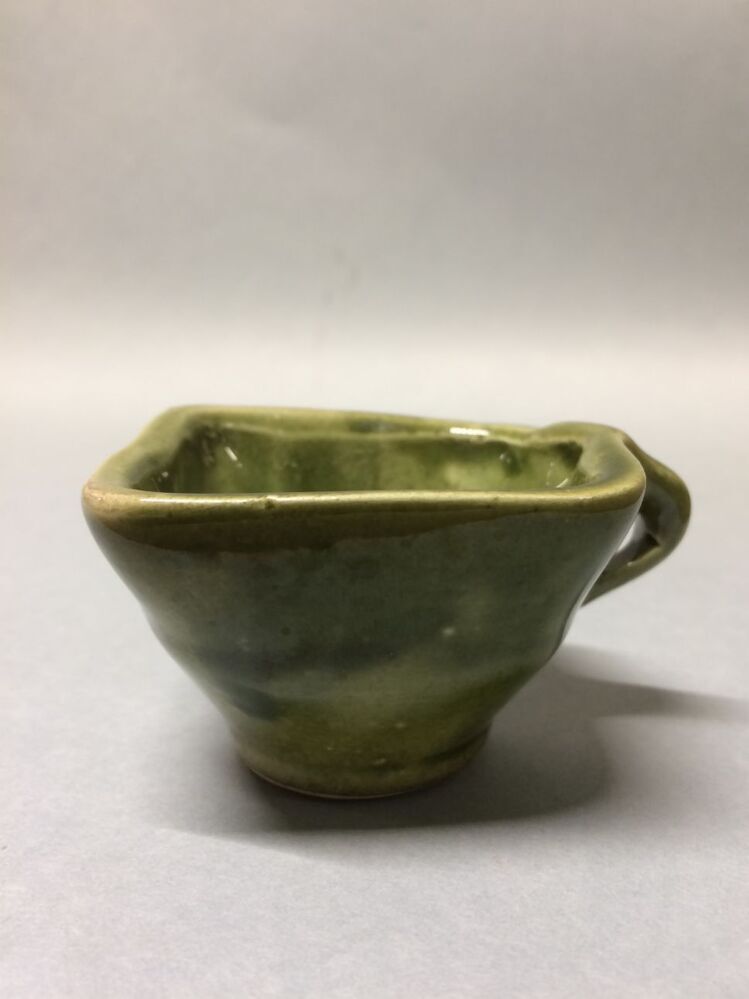 Miniatuur testje met groene glazuur, hoort bij kinderstoel van iepenhout op vier poten met deurtje