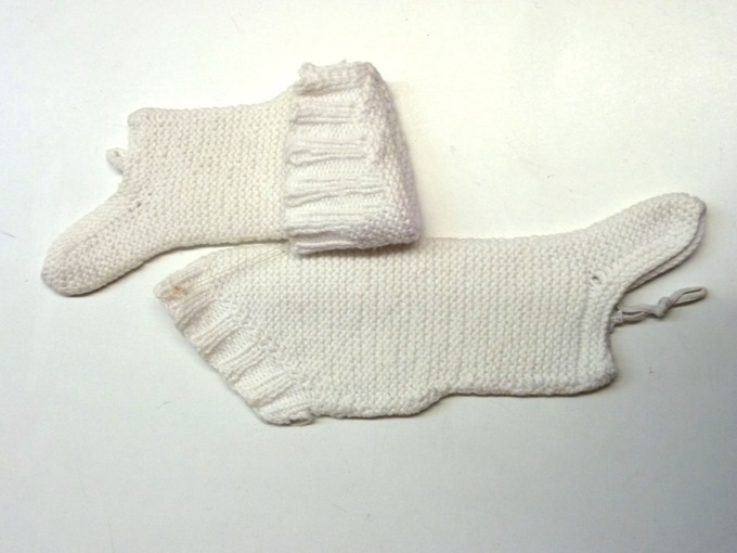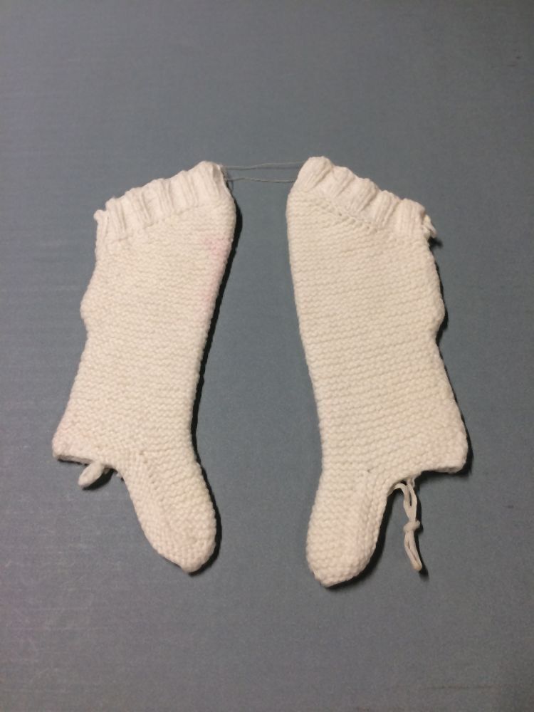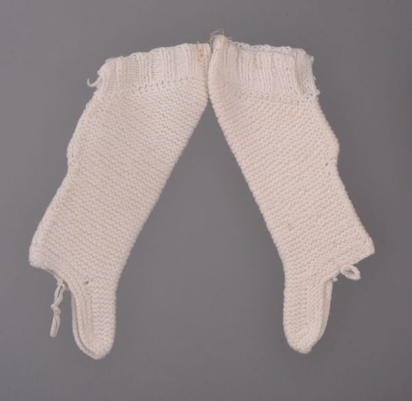 Slobkousen, gebreid van wit katoen in de vorm van voet en been