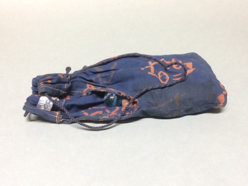 Knikkers in zak van blauw bedrukt katoen met rood-bruine chineesachtige tekens, vijftig kleiknikkers en vijf glasknikkers