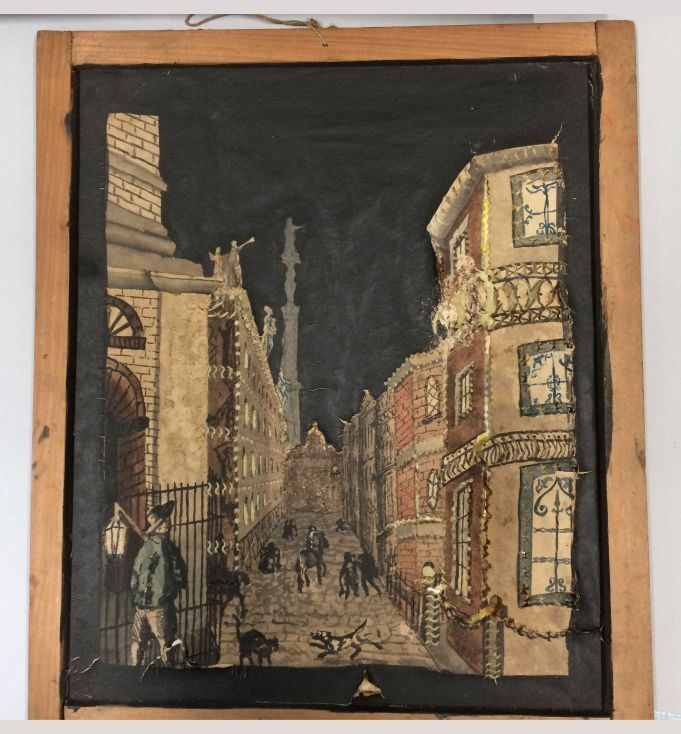 Een van zeventien panelen voor een kijkdoos, voorstellende een straatbeeld