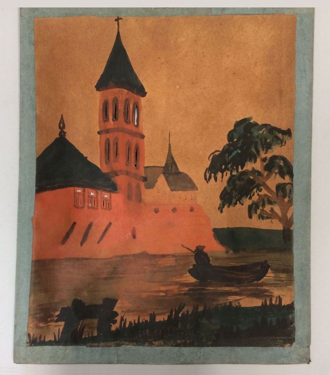 Een van zeventien panelen voor een kijkdoos, voorstellende een man op boot voor kasteel