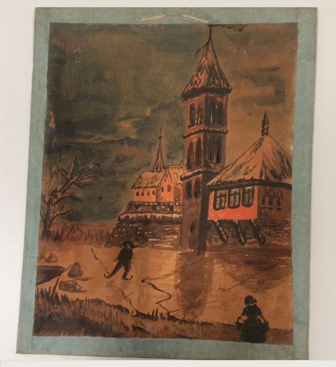 Een van zeventien panelen voor een kijkdoos, voorstellende een dorpsgezicht met schaatstende man