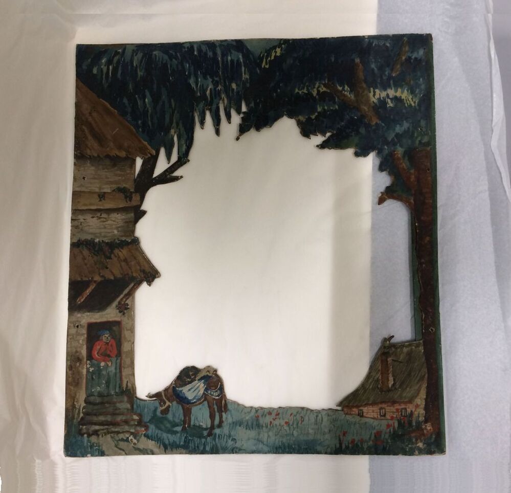 Een van zeventien panelen voor een kijkdoos, voorstellende een landschap met boom en ezel