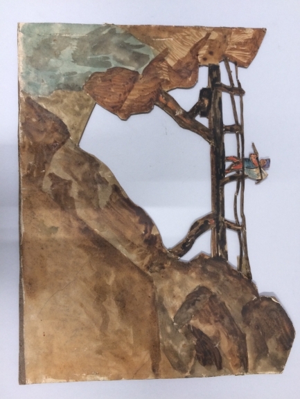 Een van zeventien panelen voor een kijkdoos, voorstellende een man op brug boven een afgrond