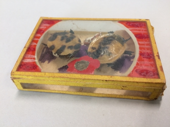 Kijkdoosje van glas met dun houten bodem, waarin 2 schildpadjes met bewegende pootjes