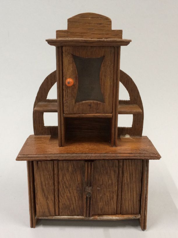 Buffetkast, onderdeel van poppenhuismeubels, bestaande uit 4 stoelen, ovale tafel (1928), bank met kast (conapé) en buffetkast
