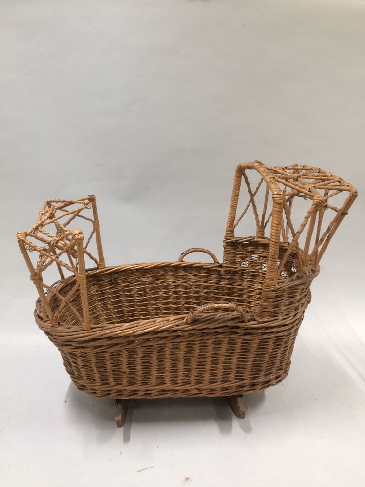 Rotan poppewieg met hemel en voeteneind op houten schommel