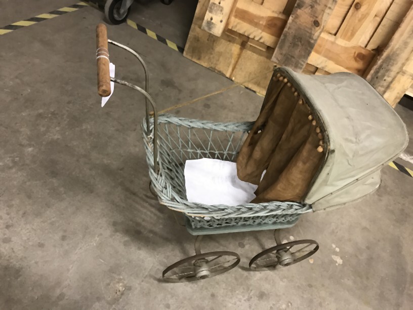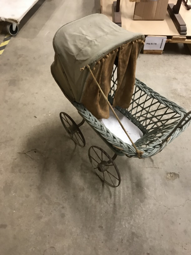 Lichtblauw rieten poppewagentje met zeildoek kap en wollen gordijntjes