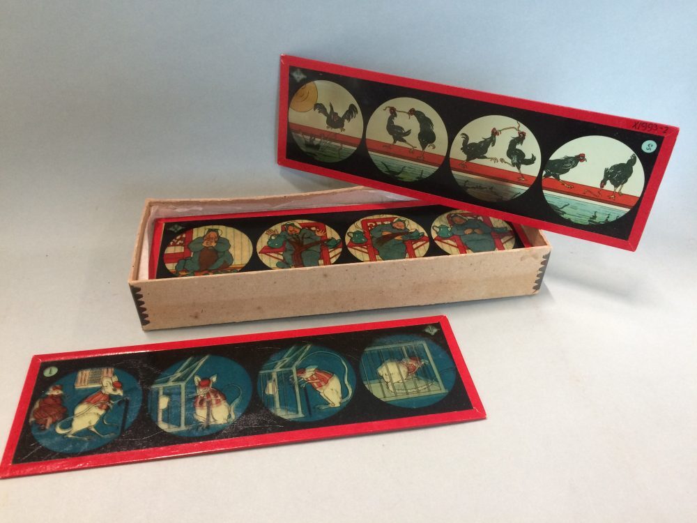 Twaalf toverlantaarnplaten met afbeeldingen van dieren en mensen
