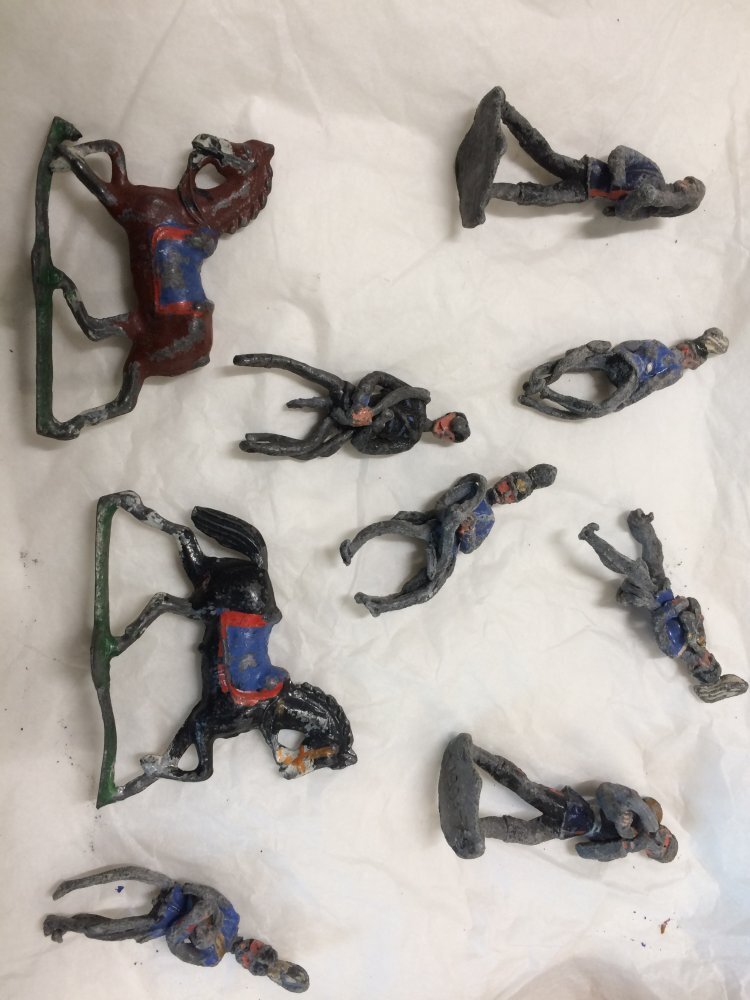Kartonnen doosje met daarin 26 tinnen soldaatjes en twee tinnen paarden