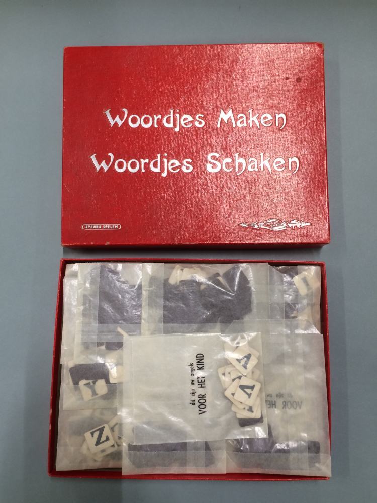 Spel met titel Woordjes maken, woordjes schaken bestaande uit papieren zakjes met losse kartonnen letters