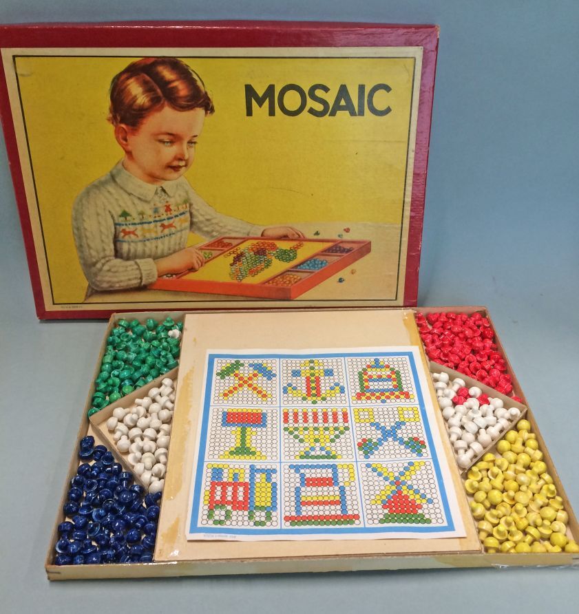 Doos met gaten en pinnetjes om mozaïekspel