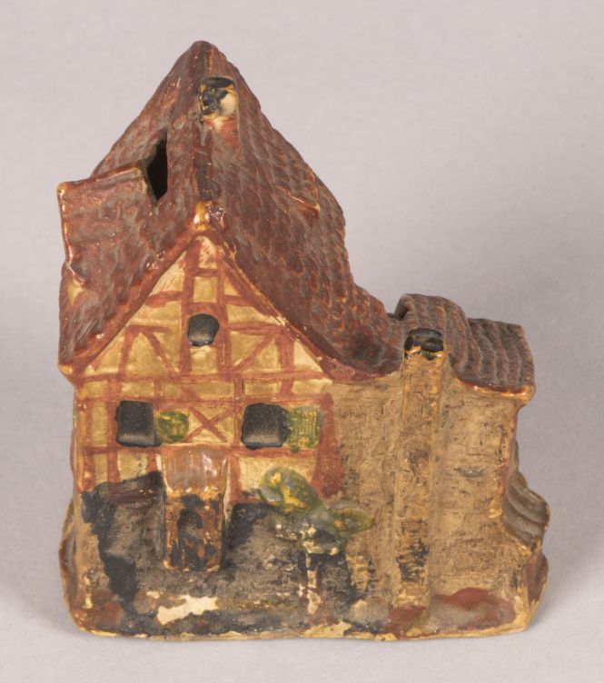 Geel, rood, groen, bruine spaarpot in vorm van huis