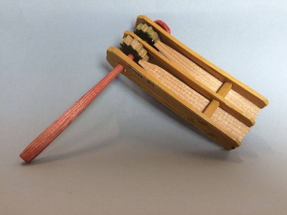 Houten ratel met rode steel, gele plankjes en groene rondjes
