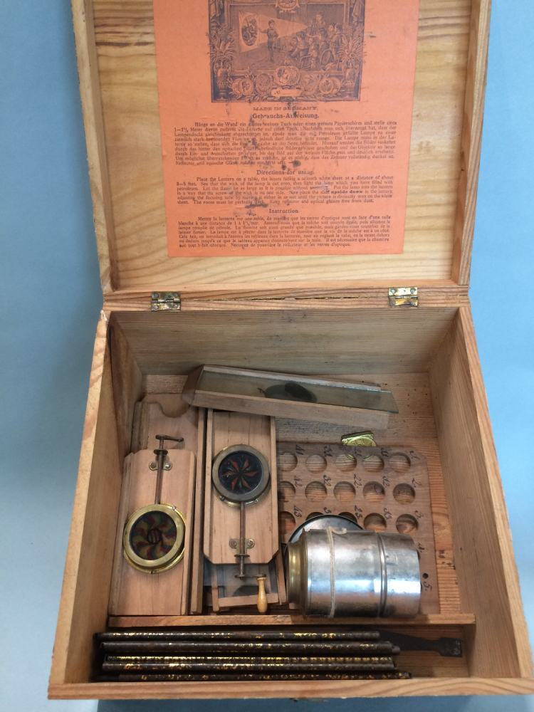 Te gebruiken voor doosachtige apparaten die bestaan uit een lamp, reflectoren om het licht te concentreren en meestal lenzen om de lichtstraal te vergroten of verkleinen, en die zijn bedoeld om afbeeldingen te projecteren die op doorzichtige glazen plaatjes zijn geschilderd en langzaam voor de lens langs worden getrokken; ze werden voor het eerst ontwikkeld halverwege de 17e eeuw. (AAT) https://data.cultureelerfgoed.nl/term/id/cht/10f7f592-e5d3-4457-98f8-840ea52d8d4f