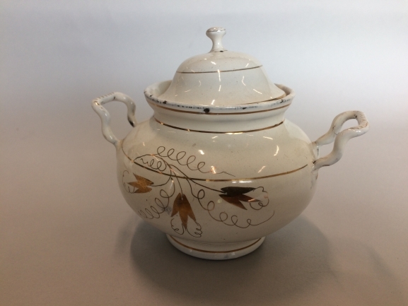 Terrine met deksel, onderdeel van servies met goudkleurige randdecoratie, bestaande uit juskom, terrine, twee onderschotels en zes borden
