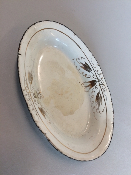 Onderschotel, onderdeel van servies met goudkleurige randdecoratie, bestaande uit juskom, terrine, twee onderschotels en zes borden