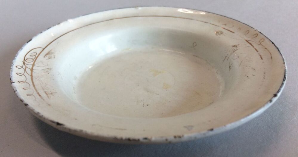 Bord, 1 van 6, onderdeel van servies met goudkleurige randdecoratie, bestaande uit juskom, terrine, twee onderschotels en zes borden