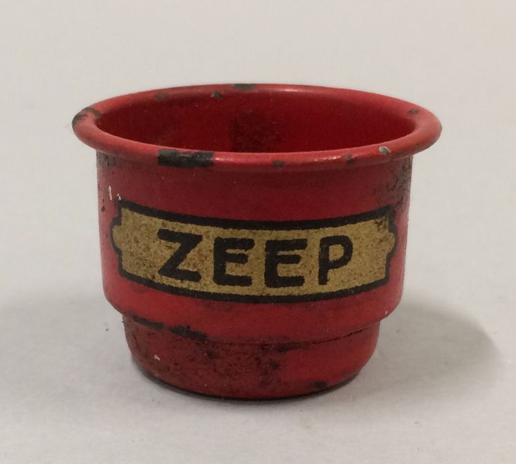 Kommetje met opschrift zeep, onderdeel van keukengerei bestaande uit rode schaal met twee kommetjes
