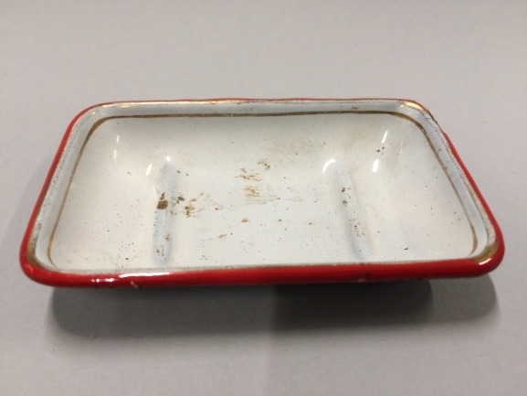 Een van twee platte, rechthoekige, witte schaaltjes met rode rand