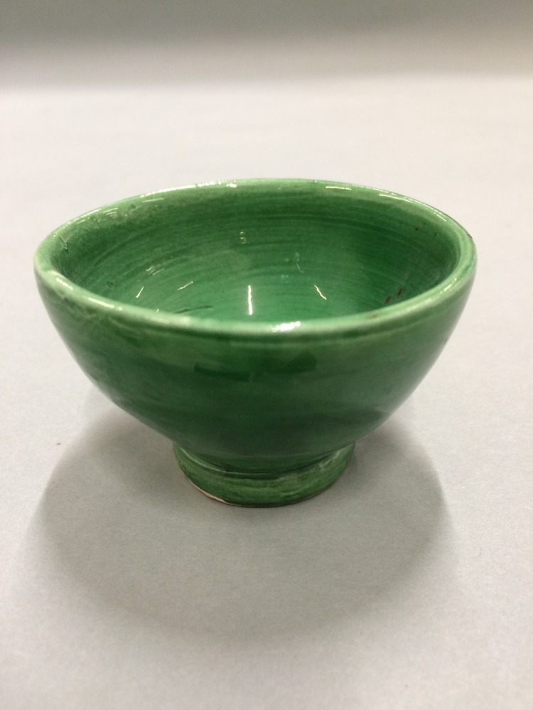 Kom, onderdeel van groen aardewerken zestiendelig servies, bestaande uit potten, kommen en drie deksels