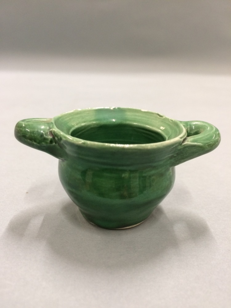 Kom, onderdeel van groen aardewerken zestiendelig servies, bestaande uit potten, kommen en drie deksels