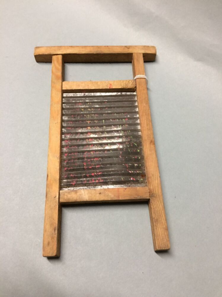 Wasbord met houten frame met geribbeld bord, op het bord is met krijt gekleurd