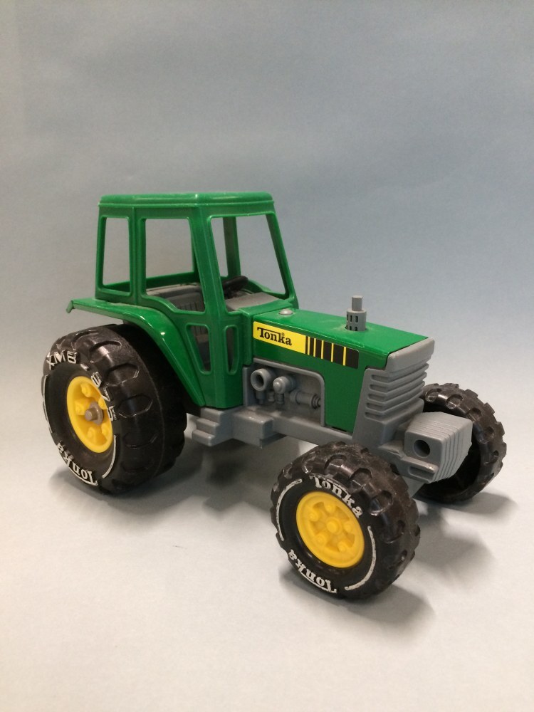 Speelgoedauto voorstellende groene tractor met zwart met gele wieldoppen vanhet merk Tonka