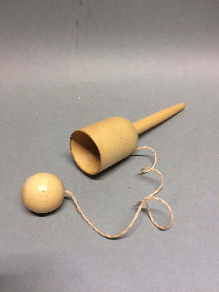 Spel bilboquet bestaande uit houten handvat met aan bovenzijde bak en touw met bal