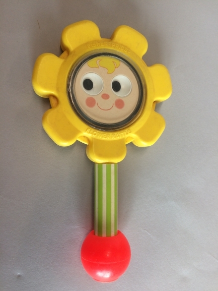 Rammelaar in de vorm van een bloem met aan de achterzijde een spiegel, genaamd Flower Rattle