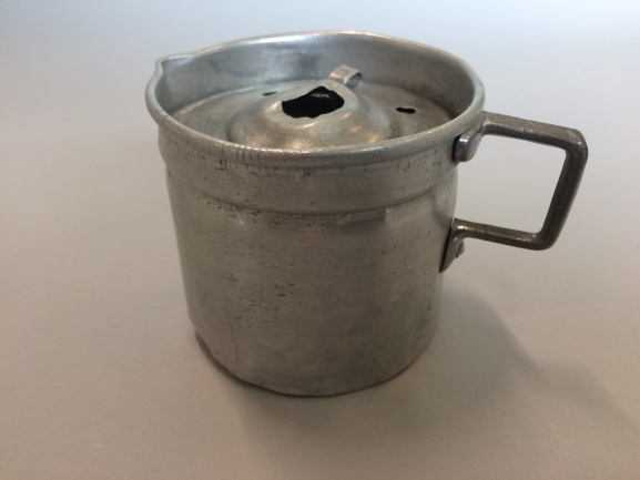 Melkkoker met deksel, onderdeel van keukengerei, bestaande uit onder meer gasstel met aluminium pannen en fluitketel
