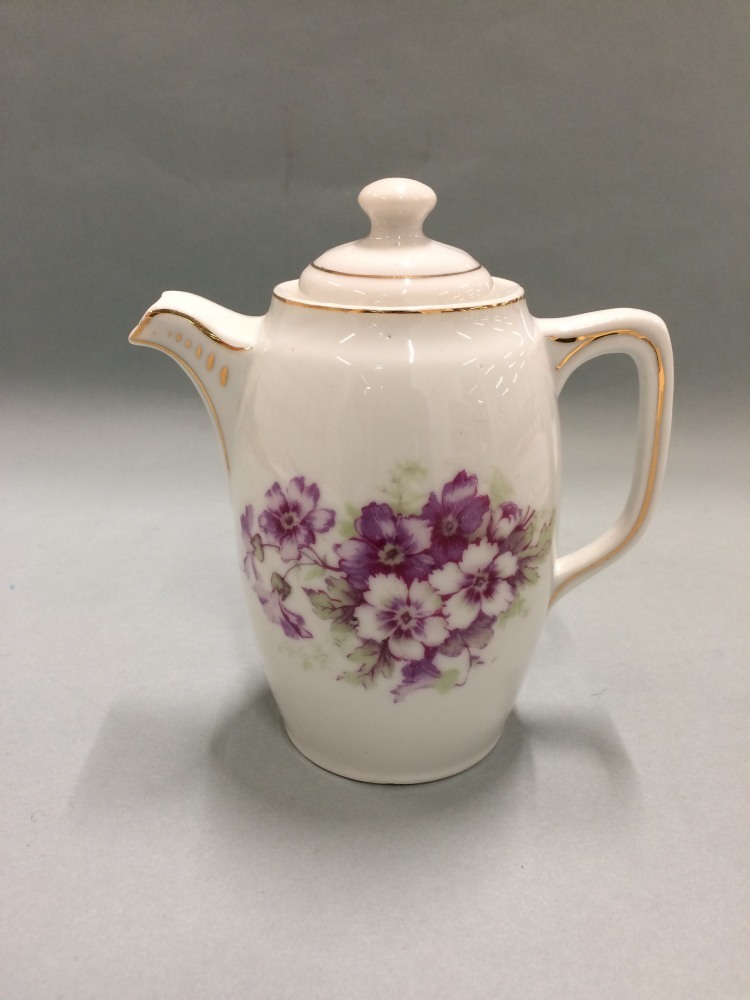 Kan, onderdeel van koffieservies voor pop met vijf kopjes, acht schoteltjes, kan, melkkan en suikerpot met decor van paarse bloemdecoratie