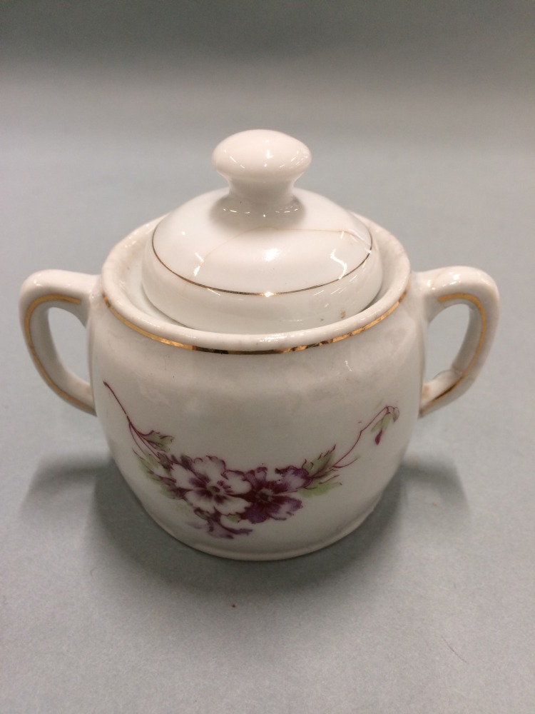 Suikerpot, onderdeel van koffieservies voor pop met vijf kopjes, acht schoteltjes, kan, melkkan en suikerpot met decor van paarse bloemdecoratie