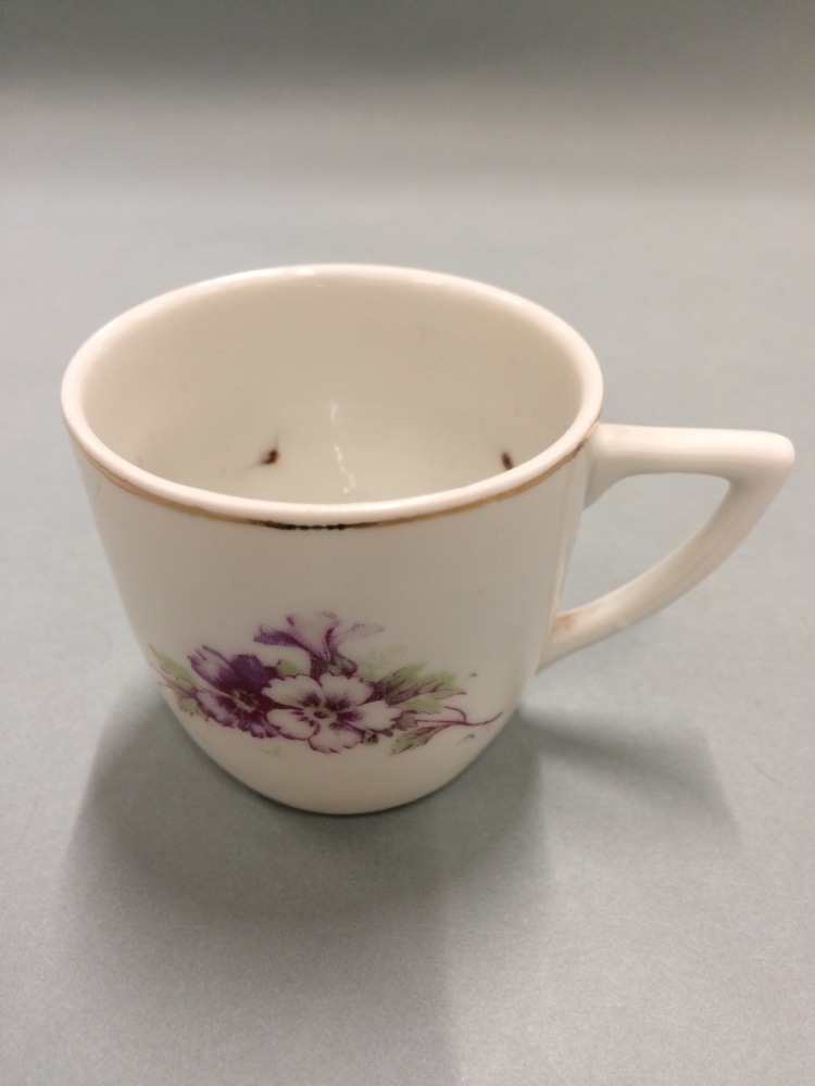 Kop, onderdeel van koffieservies voor pop met vijf kopjes, acht schoteltjes, kan, melkkan en suikerpot met decor van paarse bloemdecoratie