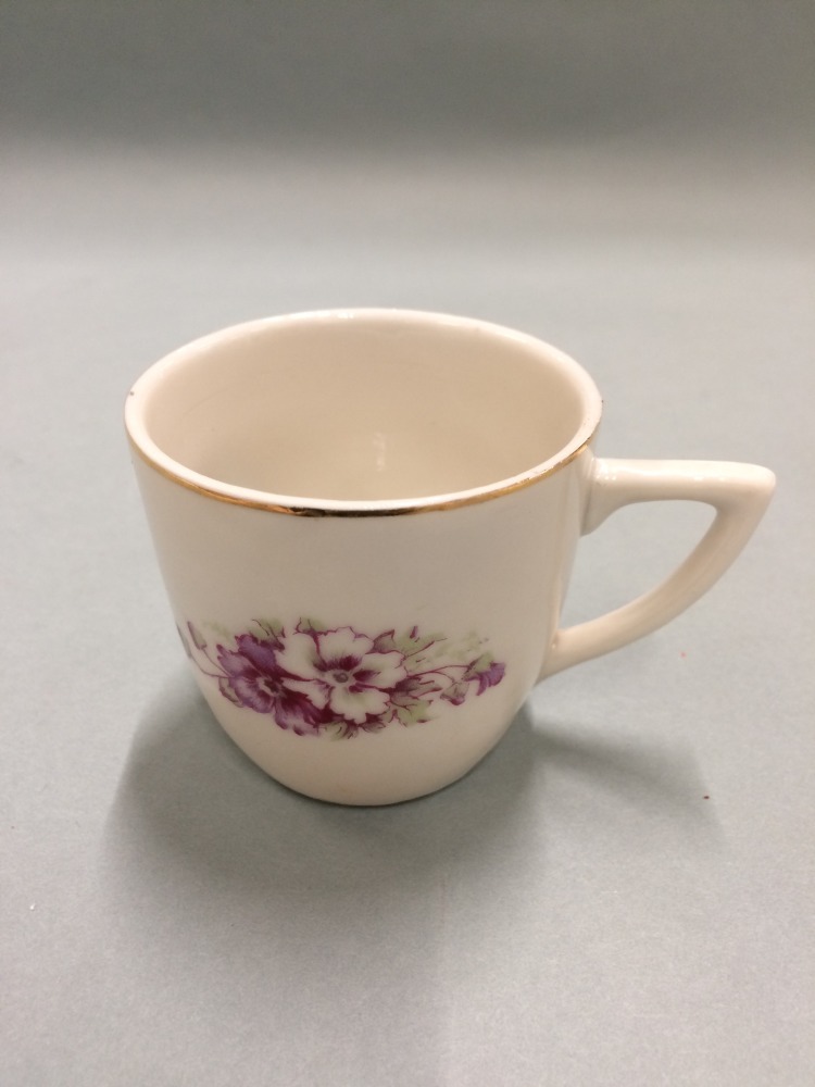 Kop, onderdeel van koffieservies voor pop met vijf kopjes, acht schoteltjes, kan, melkkan en suikerpot met decor van paarse bloemdecoratie