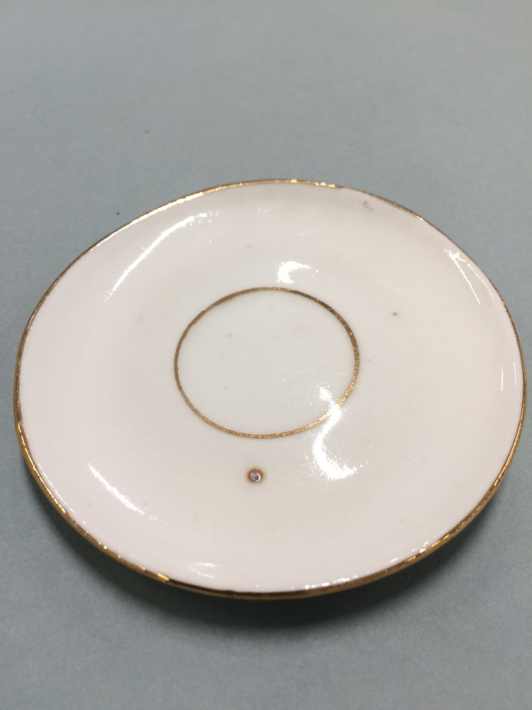 Schotel, onderdeel van koffieservies voor pop met vijf kopjes, acht schoteltjes, kan, melkkan en suikerpot met decor van paarse bloemdecoratie