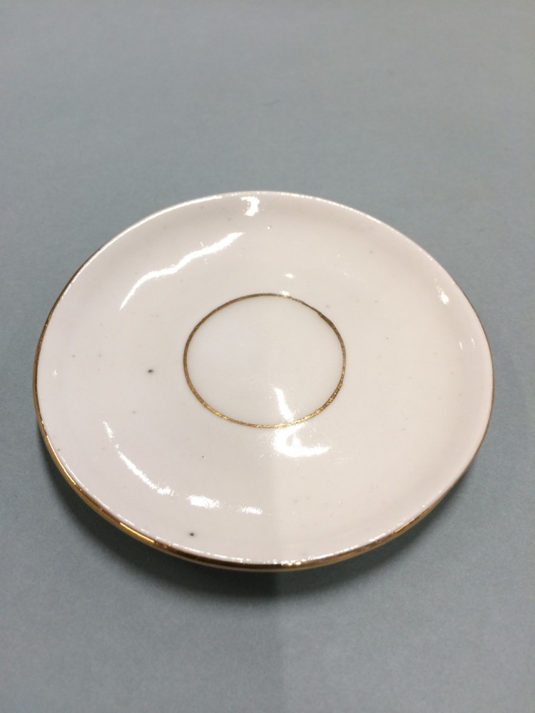Schotel, onderdeel van koffieservies voor pop met vijf kopjes, acht schoteltjes, kan, melkkan en suikerpot met decor van paarse bloemdecoratie