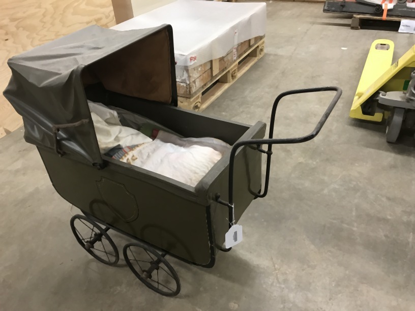 Poppenwagen met zeildoek kap, donkergroen, met beddengoed