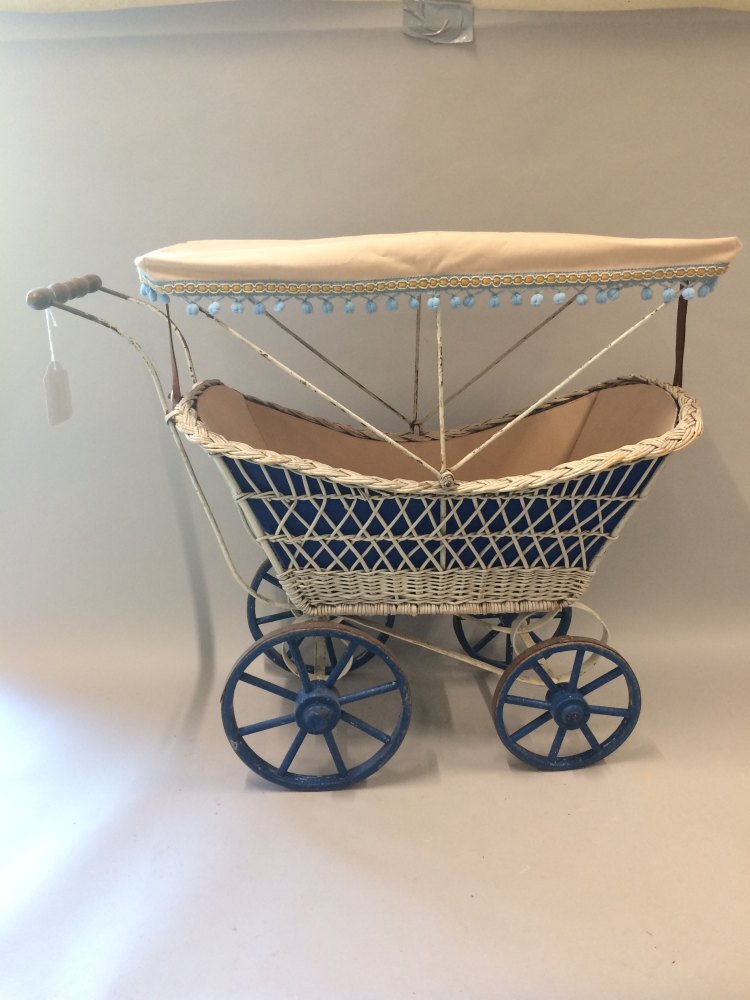 Witte rieten poppenwagen met luifel, op verend onderstel met blauwgeverfde wielen