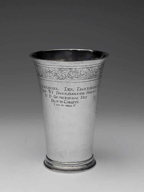 Kleine wijnbeker die wordt uitgedeeld aan iedere deelnemer aan het heilig avondmaal. De wijn wordt in het bekertje geschonken met de avondmaalskan. https://data.cultureelerfgoed.nl/term/id/cht/cd64ed8c-26c3-4312-b203-f2f5d81a6220