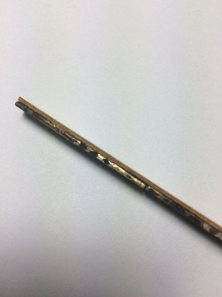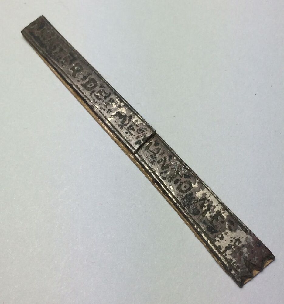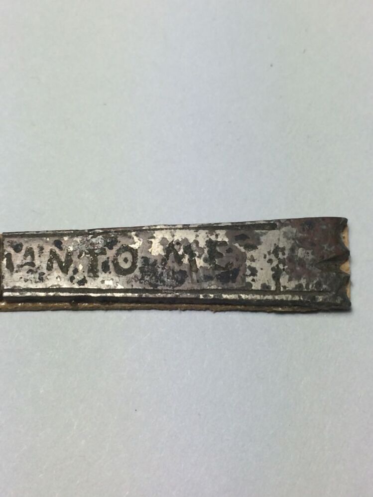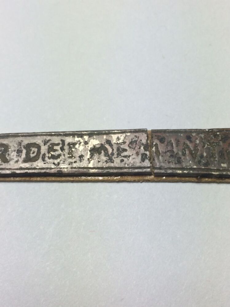 Plat staafje (rijgpen?) met inscriptie: O MATER DEI MEMENTO ME