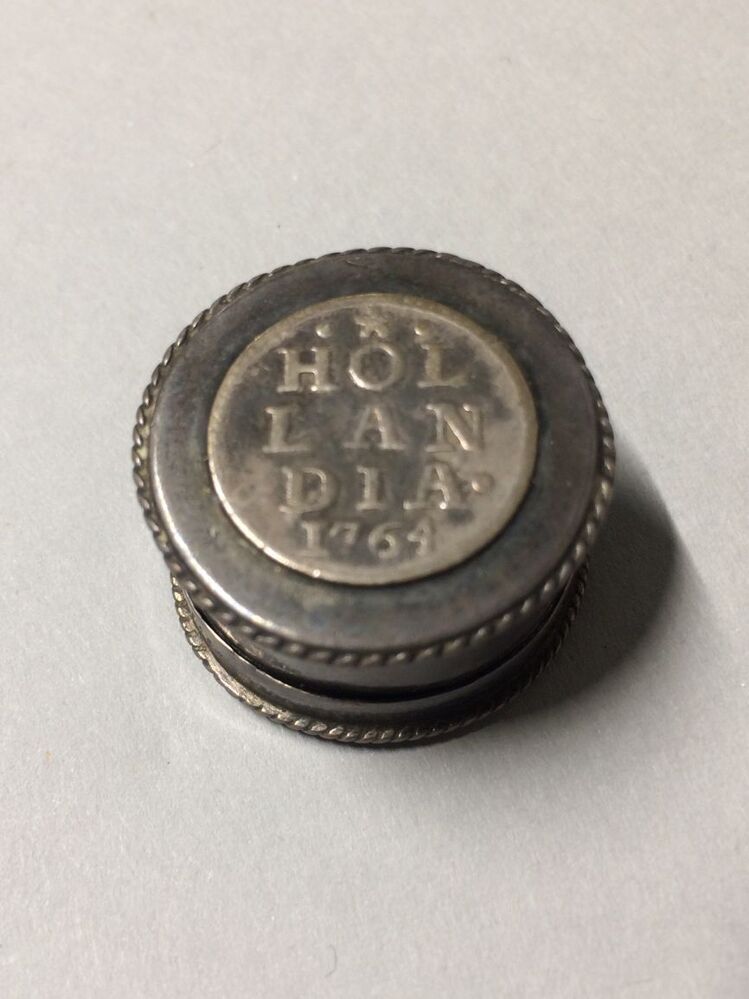 Muntdoosje met onderop de bodem en bovenop het deksel twee Hollandse bezemstuivertjes
