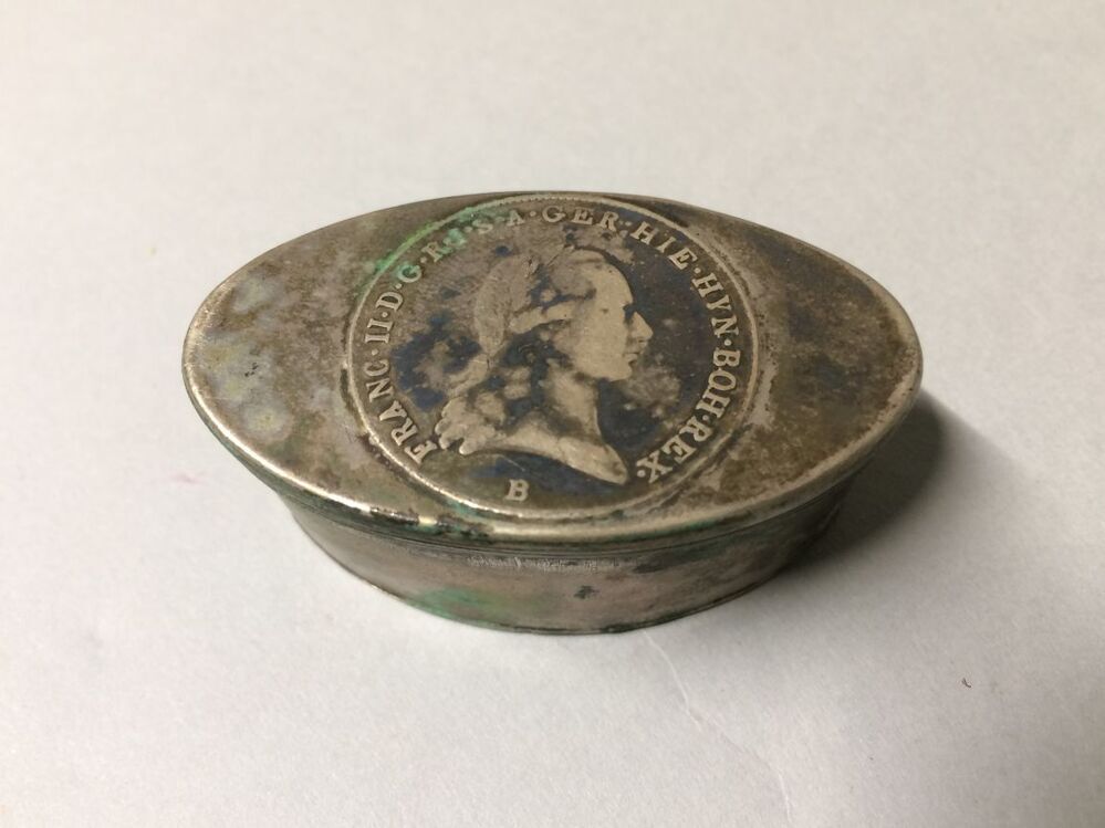 Ovaal snuifdoosje met op deksel munt met portretkop van Frans II van Hongarije en profil, met lauwerkrans