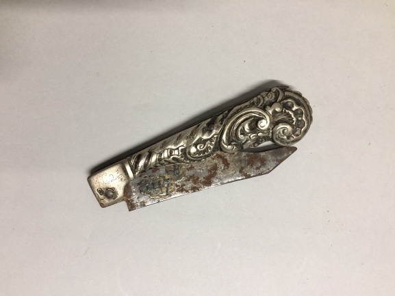 Zakmes met zilveren heft en een scharnierend spits toelopend lemmet
