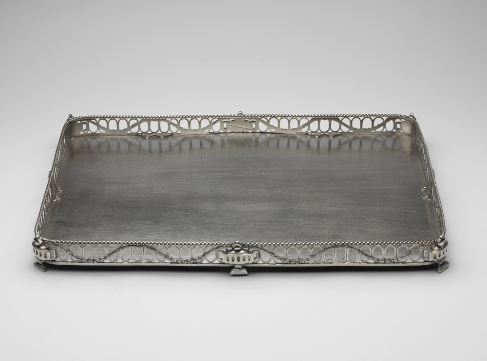 Presenteerblad waarvan de ajourrand bestaat uit staande ovale medaillons met een golvende guirlande erop