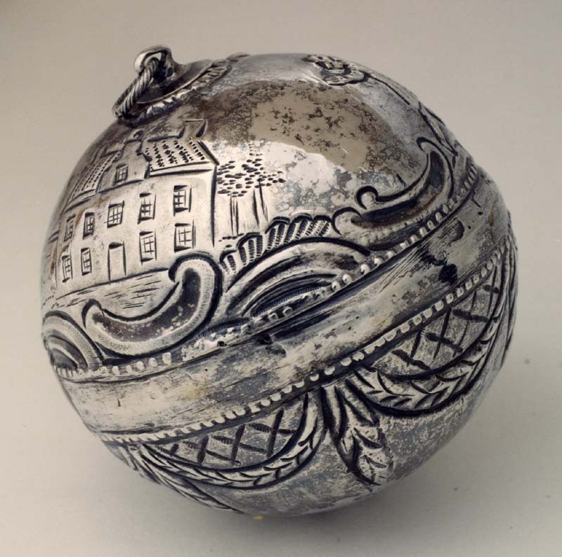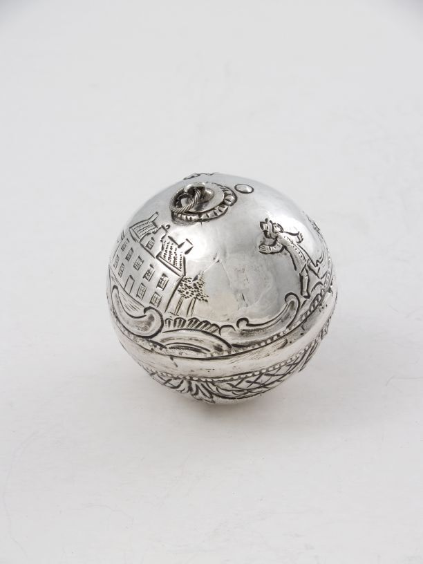 Zilveren kaatsbal met gedreven ornament en een afbeelding van twee kaatsende mannen en een huis met een trapgevel in het midden