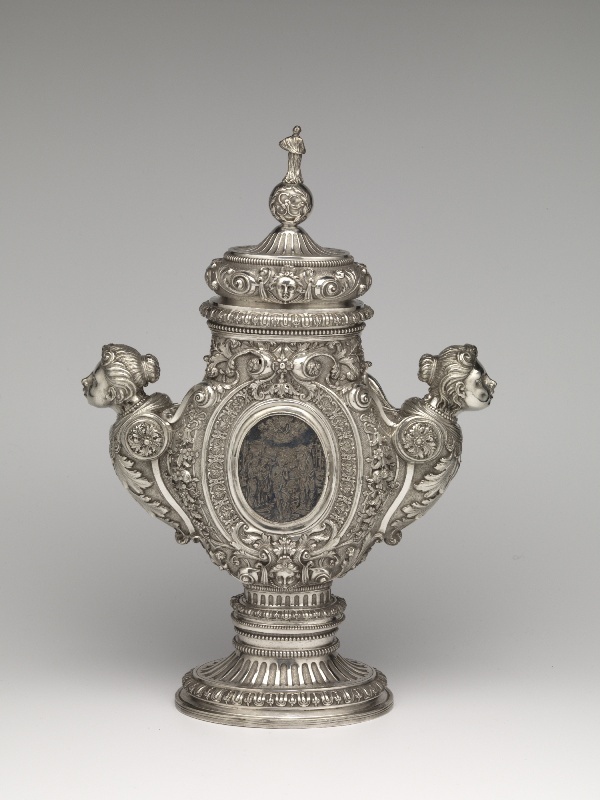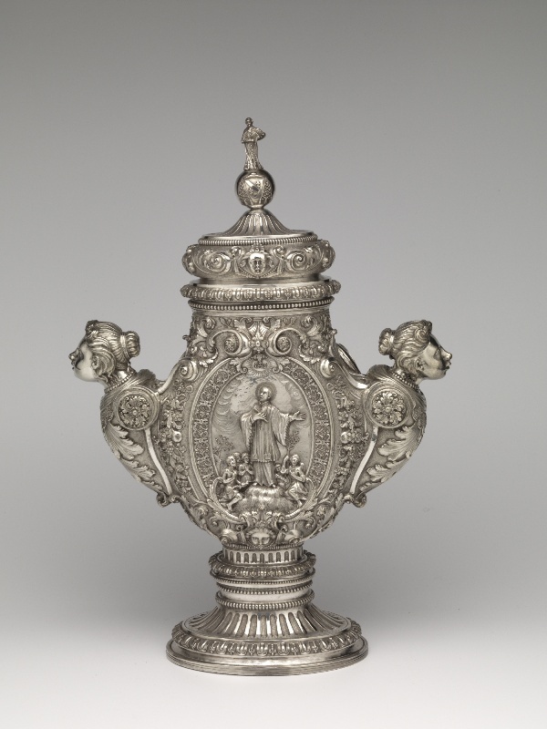 Reliekhouder met een gedreven handvat, in de vorm van een vrouw ten halve lijve en een afbeelding van de doop van Christus in de Jordaan