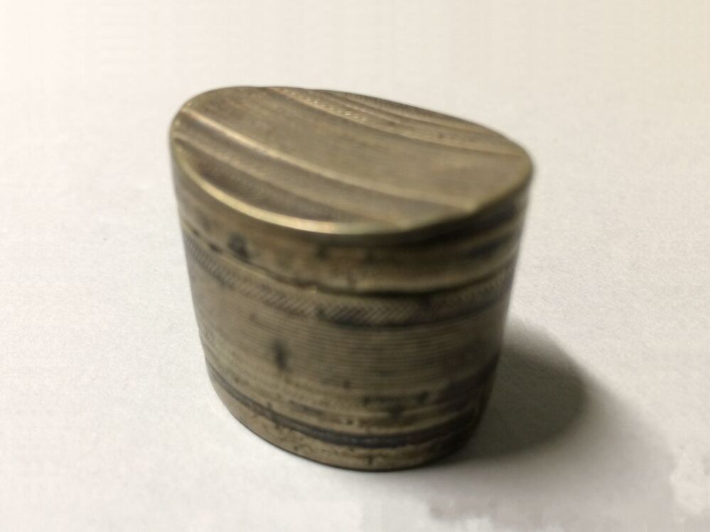 Ovaal lodderijndoosje met op de sluitring van het deksel een reeks bloempjes